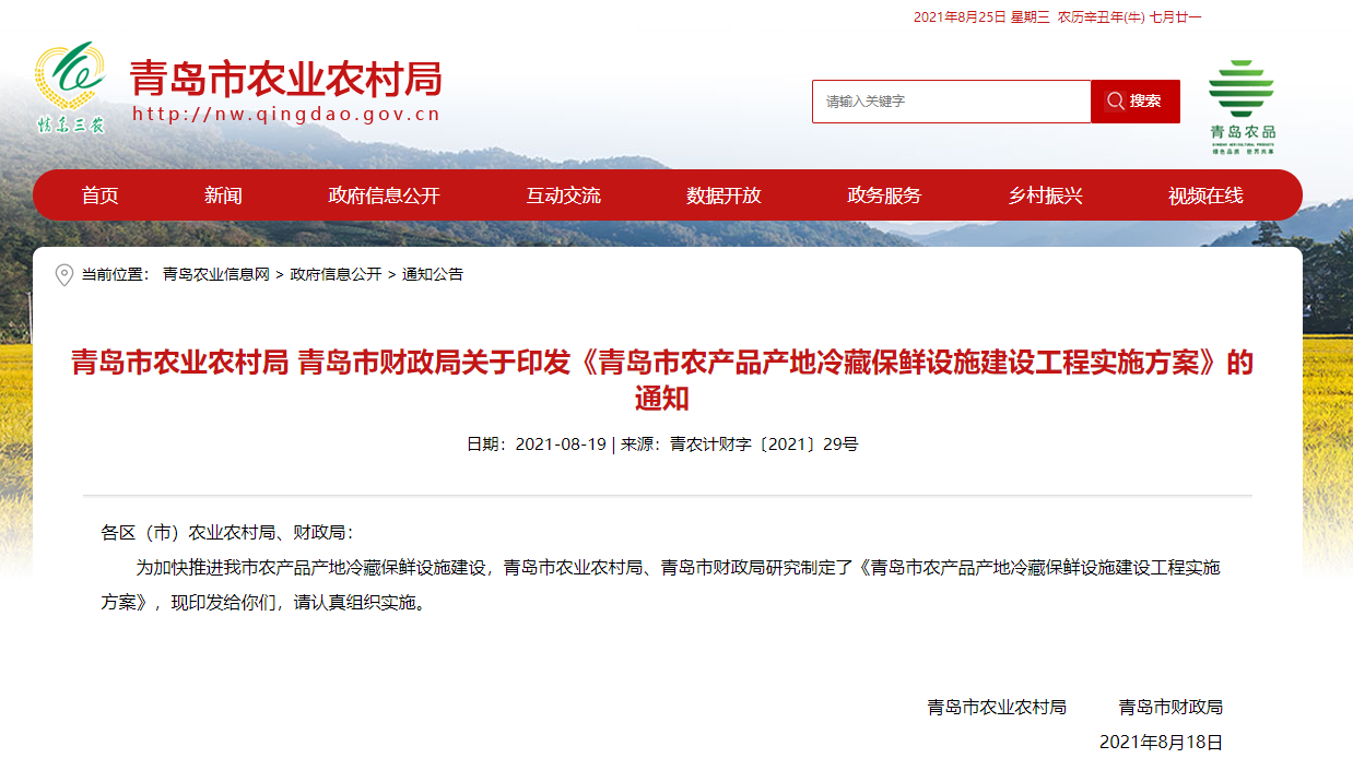 預冷及配套設施設備。根據產品特性、市場發展和儲運加工的實際需要,規模較大的設施,可配套建設強制通風預冷、差壓預冷或真空預冷等預冷庫或預冷設施,配備必要的稱量、清洗、分級、檢測、信息采集等設備以及新建貯藏設施專用的供配電設備。農產品產地冷藏保鮮設施建設規模在500噸以上的,要將信息采集監測傳輸視頻設備與青島市農業農村大數據平臺互聯互通。