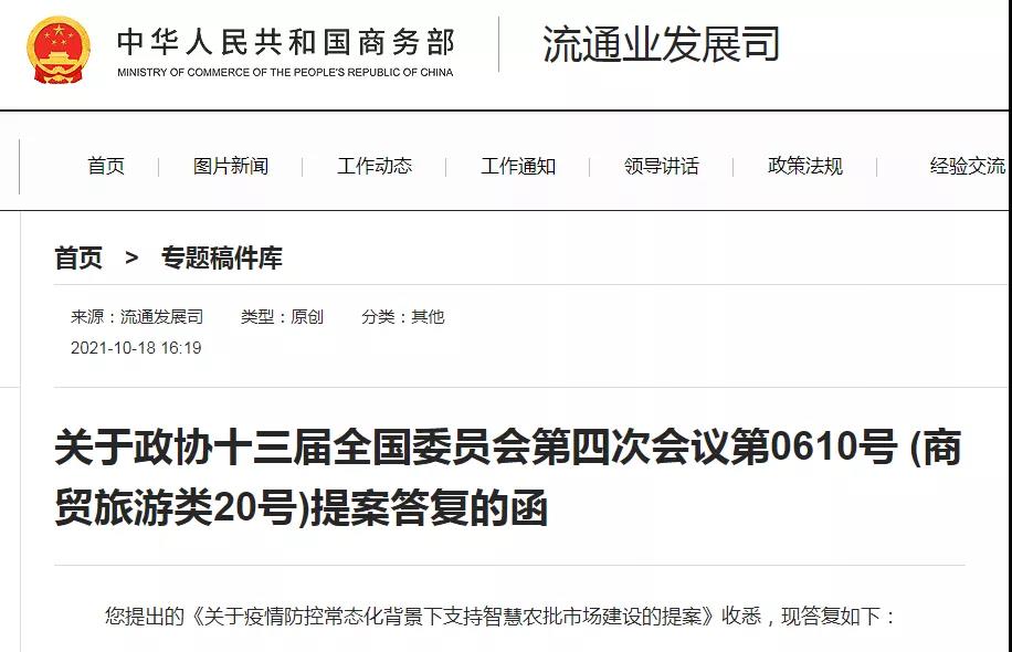 您提出的《關于疫情防控常態化背景下支持智慧農批市場建設的提案》收悉,現答復如下: