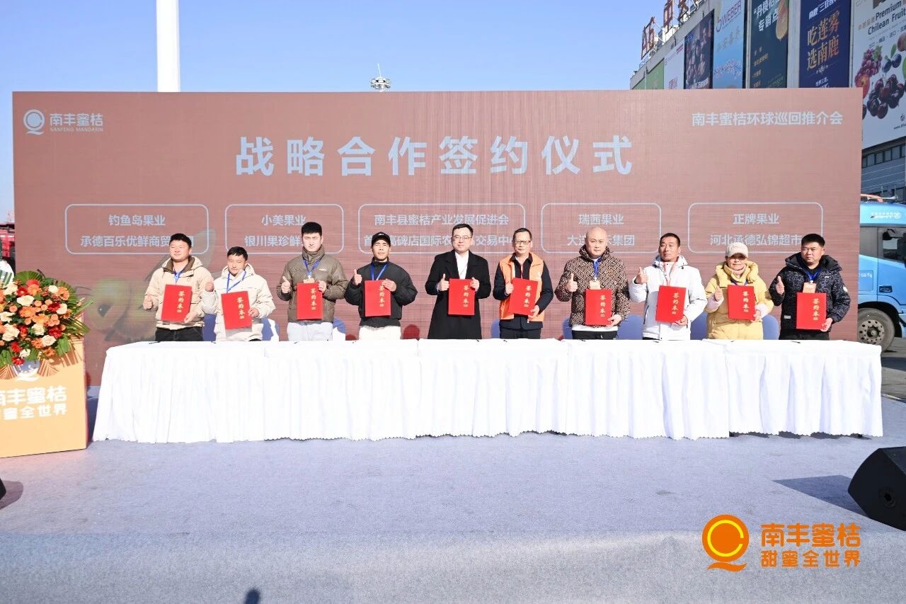 在隨后舉行的戰略合作簽約儀式中,首衡市場與南豐縣蜜桔產業發展促進會簽署了戰略合作協議。同時,四家市場商戶也與南豐企業現場達成簽約,進一步拓寬了南豐蜜桔在華北的落地渠道。